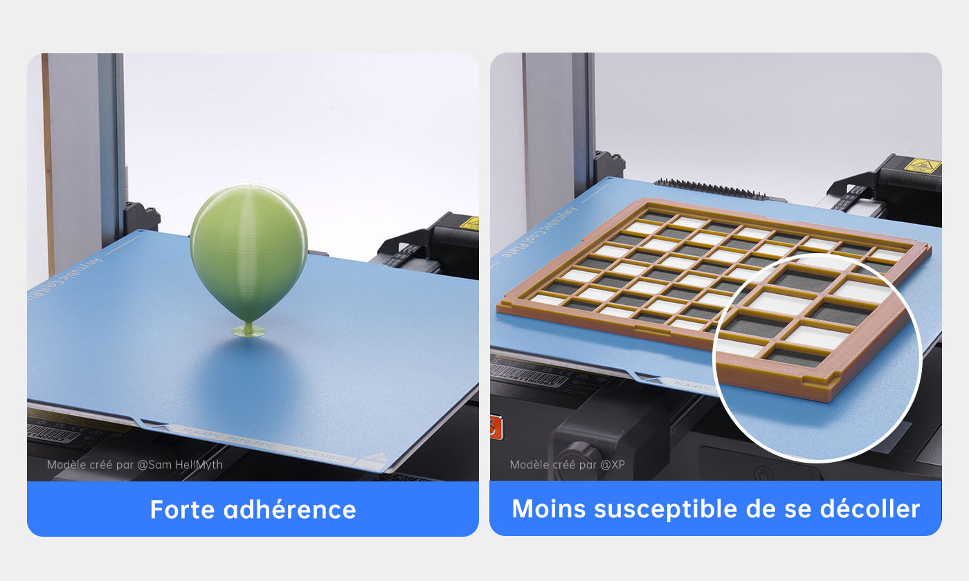 Le traitement de surface spécial appliqué sur la plaque de refroidissement offre aux filaments PLA une adhérence extrêmement forte à seulement 45 °C. Cela réduit efficacement les risques de déformation et de séparation de la couche inférieure lors de l'impression de petites pièces et de modèles à grande échelle.