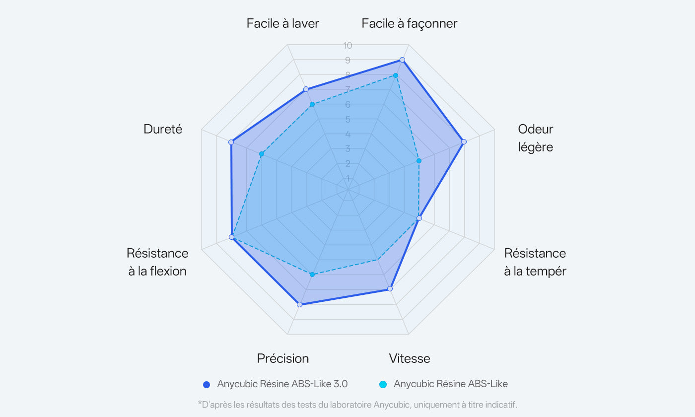 Performances équilibrées, résistance aux chocs et à l'usure. Atteint un allongement à la rupture impressionnant de 30 %, soit près du double des 13 % des autres résines de type ABS, ce qui lui permet de mieux résister aux contraintes et à la déformation.