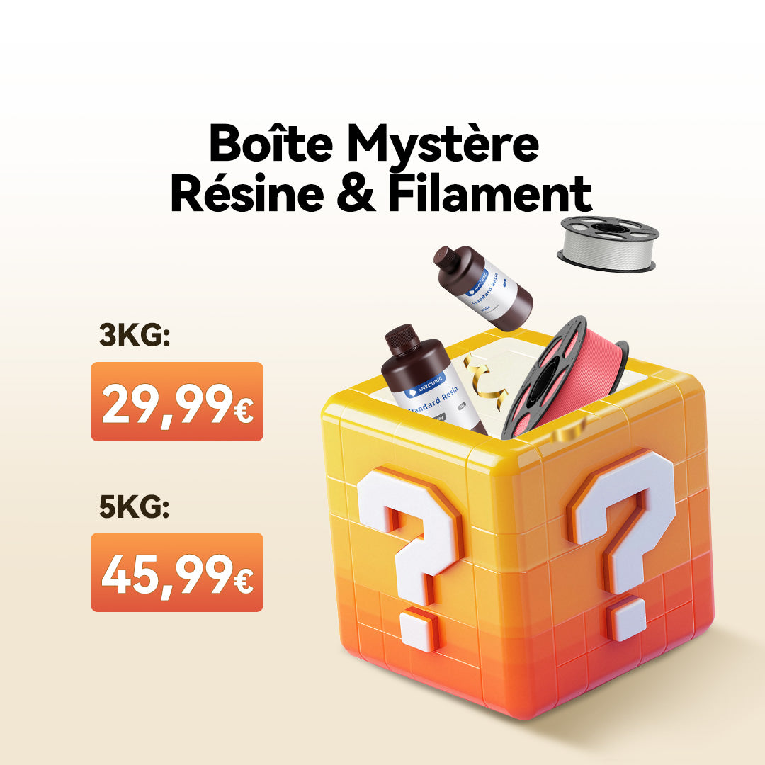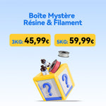 Choisissez entre les Mystery Boxes de Filament ou de Résine. Confirmez le type de matériau dont vous avez besoin avant d'acheter.