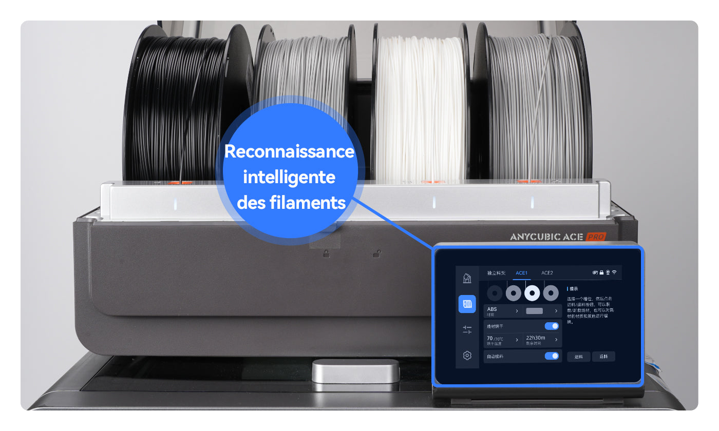 Les filaments sont équipés de puces d’identification intelligente qui s’intègrent parfaitement à l’ACE Pro, permettant l’identification automatique des informations d’impression et améliorant l’expérience d’impression.