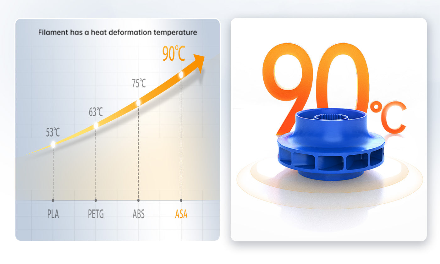 Plus stable à haute température que les autres matériaux standard. Le filament ASA d'Anycubic présente une température de déformation thermique pouvant atteindre 90 °C, tandis que l'ABS, le PETG et le PLA ont respectivement des températures de 75 °C, 63 °C et 53 °C.