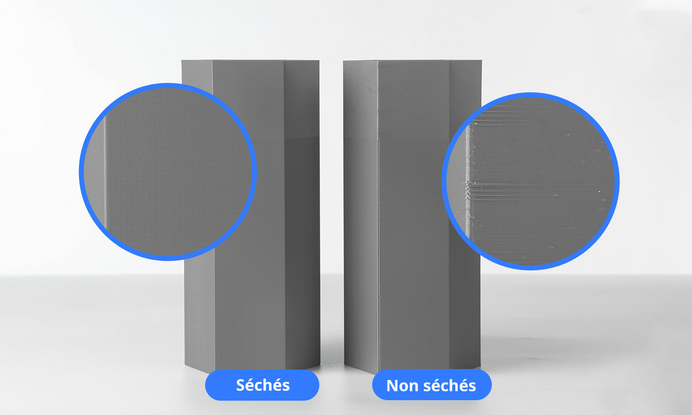 Les filaments PETG doivent être séchés avant l’impression et stockés dans un environnement à humidité contrôlée afin d’éviter la formation de bulles d’air pendant l’impression.