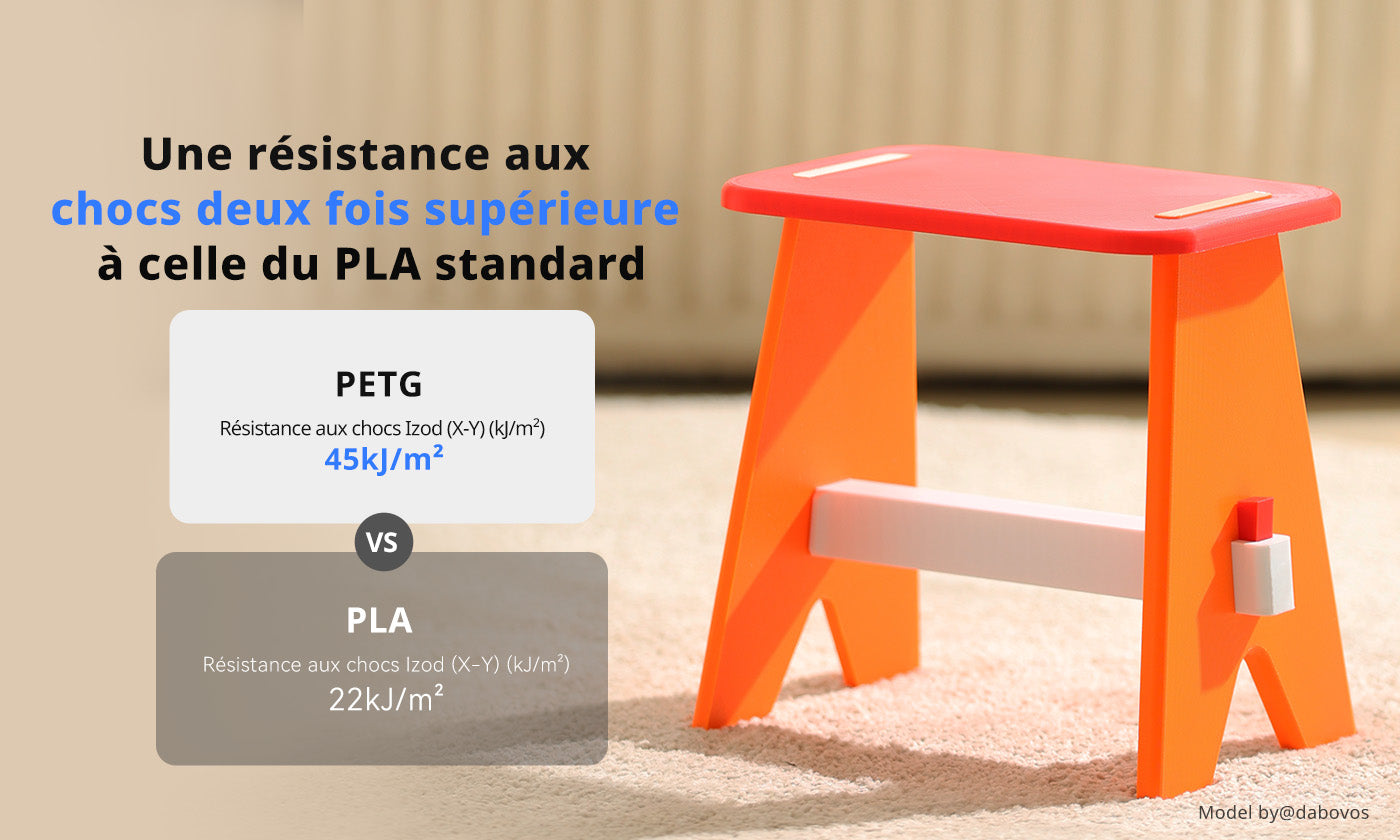 Le PETG combine la facilité d’impression du PLA avec la robustesse de l’ABS. Sa résistance aux chocs est deux fois supérieure à celle du PLA standard. Les modèles conservent leur intégrité structurelle même en cas de chute ou de contraintes, ce qui en fait un excellent choix pour les jouets, les châssis et les prototypes mécaniques.