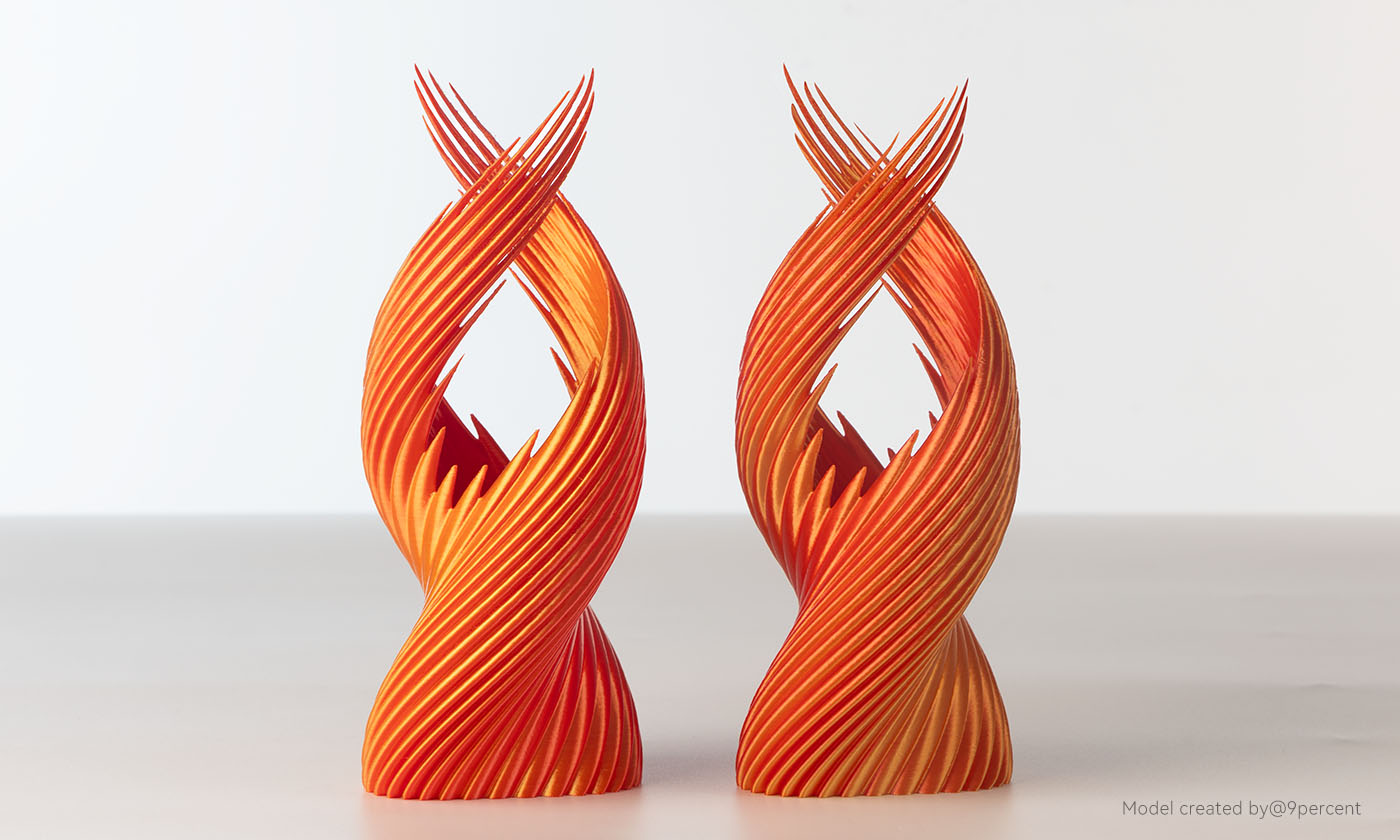 En ajustant la température de la buse et la vitesse d'impression, vous pouvez personnaliser la brillance du modèle. Lorsque la température de la buse est plus élevée ou que la vitesse d'impression est plus lente, le filament est chauffé plus en profondeur, ce qui augmente sa fluidité pendant l'impression et crée une surface lisse avec une finition brillante et soyeuse.