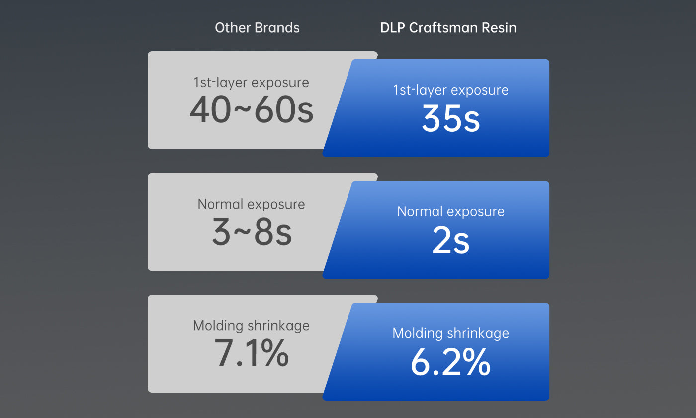 Bénéficiant également d'une formule améliorée, la résine Anycubic DLP Craftsman offre non seulement une grande précision d'impression, une longue durée de conservation et une vitesse d'impression rapide, mais aussi un faible taux de rétrécissement. Le temps d'exposition initial peut être aussi rapide que 35 secondes (beaucoup plus rapide que les 60 secondes des autres marques), et l'exposition ordinaire peut être aussi rapide que 2 secondes par couche (beaucoup plus rapide que les 8 secondes de certains produits concurrents), ce qui vous permet de gagner du temps d'attente pour l'impression 3D et d'améliorer considérablement votre efficacité au travail. Le retrait au moulage est de seulement 3,7 %, bien inférieur à celui de certains produits concurrents (7,1 %). Une fois refroidie, l'impression finale ne diffère pas beaucoup de l'impression initiale. Ce que vous voyez est ce que vous obtenez.
