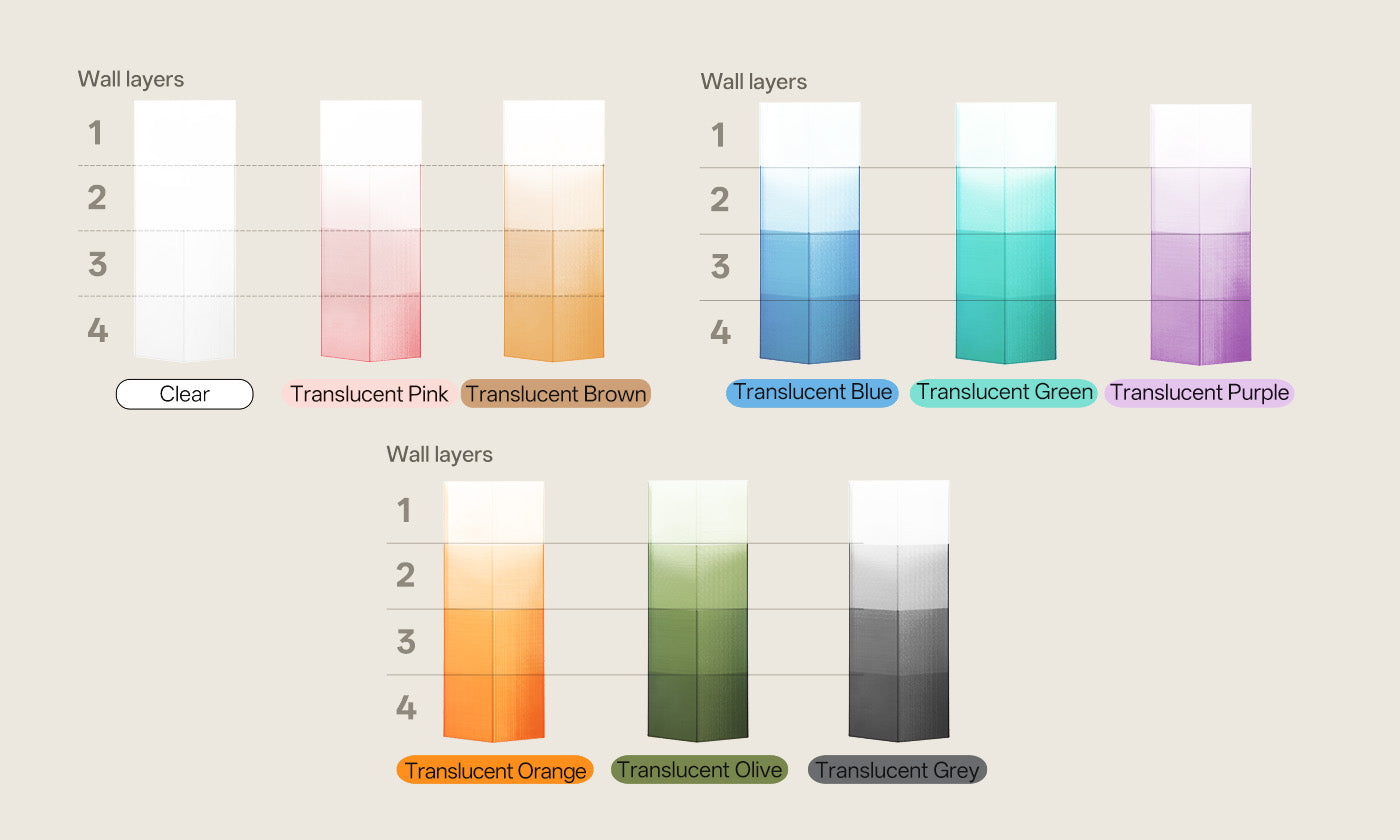 You can adjust the light transmission rate by altering the thickness of the print walls, creating prints that are rich in visual dynamics and, quite literally, have layers.