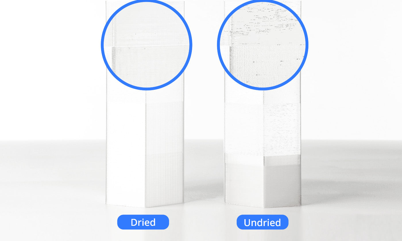 You must dry PETG Translucent filaments before printing and store them in a moisture-controlled environment to prevent air bubbles during printing.