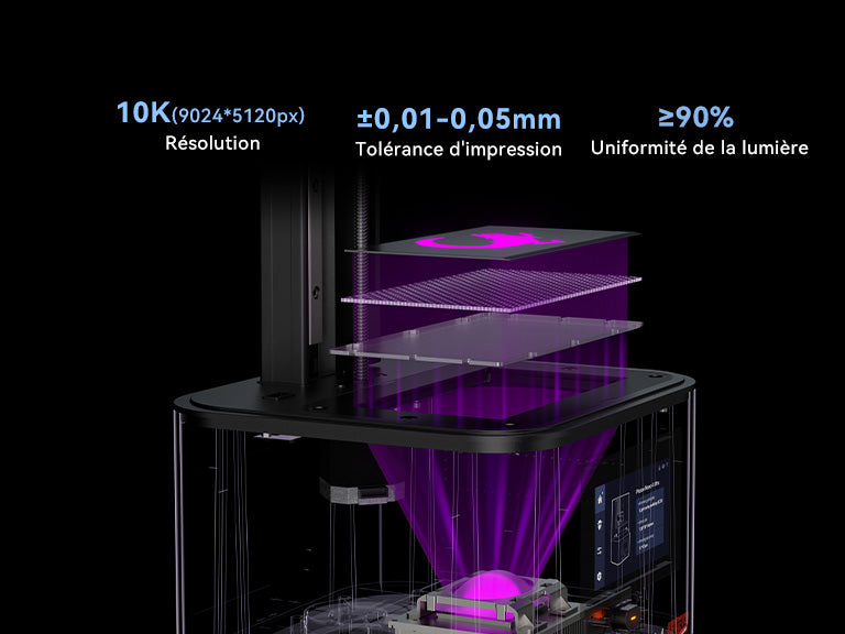 Vous pouvez imprimer facilement des modèles très détaillés, des miniatures et des conceptions complexes. La combinaison d'une résolution de 10K et de réglages optiques précis garantit des modèles aux détails complexes et aux surfaces lisses.