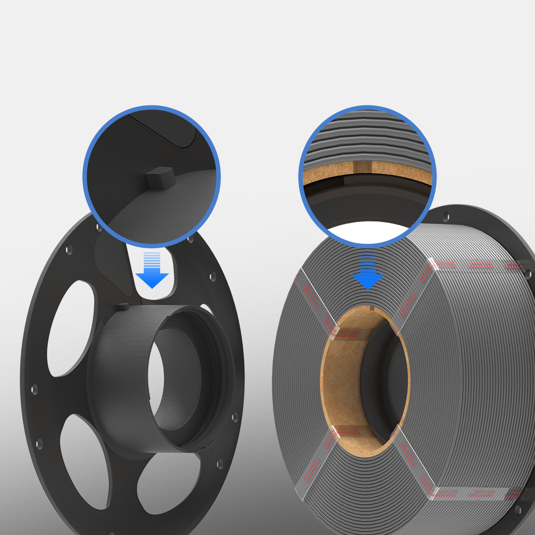 La bobine de filament réutilisable intègre un système de connexion fileté conçu pour offrir une stabilité accrue lorsqu'elle est associée à des filaments sans bobine. Cette conception réduit considérablement le risque d'enchevêtrement, de dispersion du filament et d'erreurs de fonctionnement.
