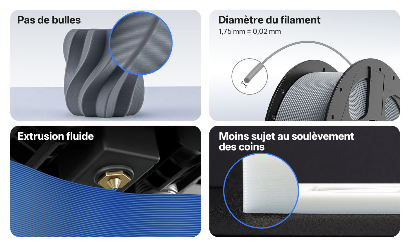 Avec une résistance deux fois supérieure à celle du PLA standard, les filaments PLA+ offrent une résistance aux chocs et une stabilité structurelle supérieures, même sous contrainte. Ces matériaux haute performance conservent leur précision dimensionnelle tout en prolongeant la durée de vie des pièces imprimées en 3D, ce qui les rend idéaux pour les composants techniques et les pièces soumises à des charges.