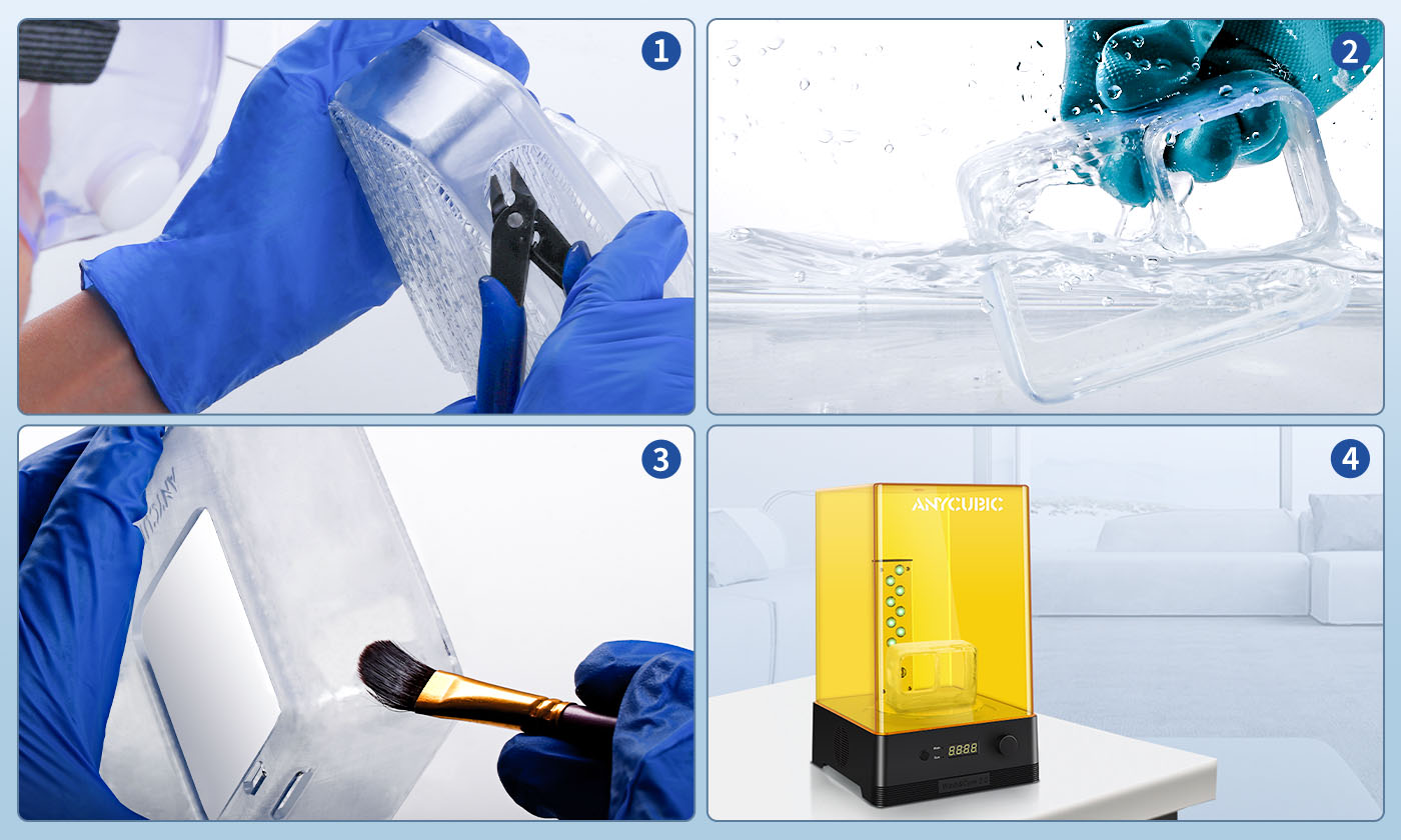B. Plongez le modèle dans la solution de nettoyage, rincez-le ou lavez-le par ultrasons, puis retirez-le et égouttez-le ; il est recommandé d'utiliser les machines ANYCUBlC Wash et Cure pour garantir un meilleur résultat.