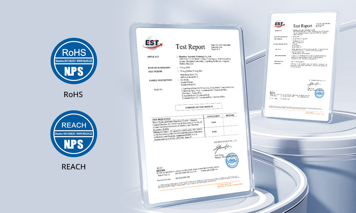 La résine UV à base végétale Anycubic 2.0 est principalement dérivée de soja, offrant une expérience d'impression à faible odeur. Certifiée conforme aux normes RoHS et REACH, elle garantit une utilisation plus sûre et une tranquillité d'esprit.